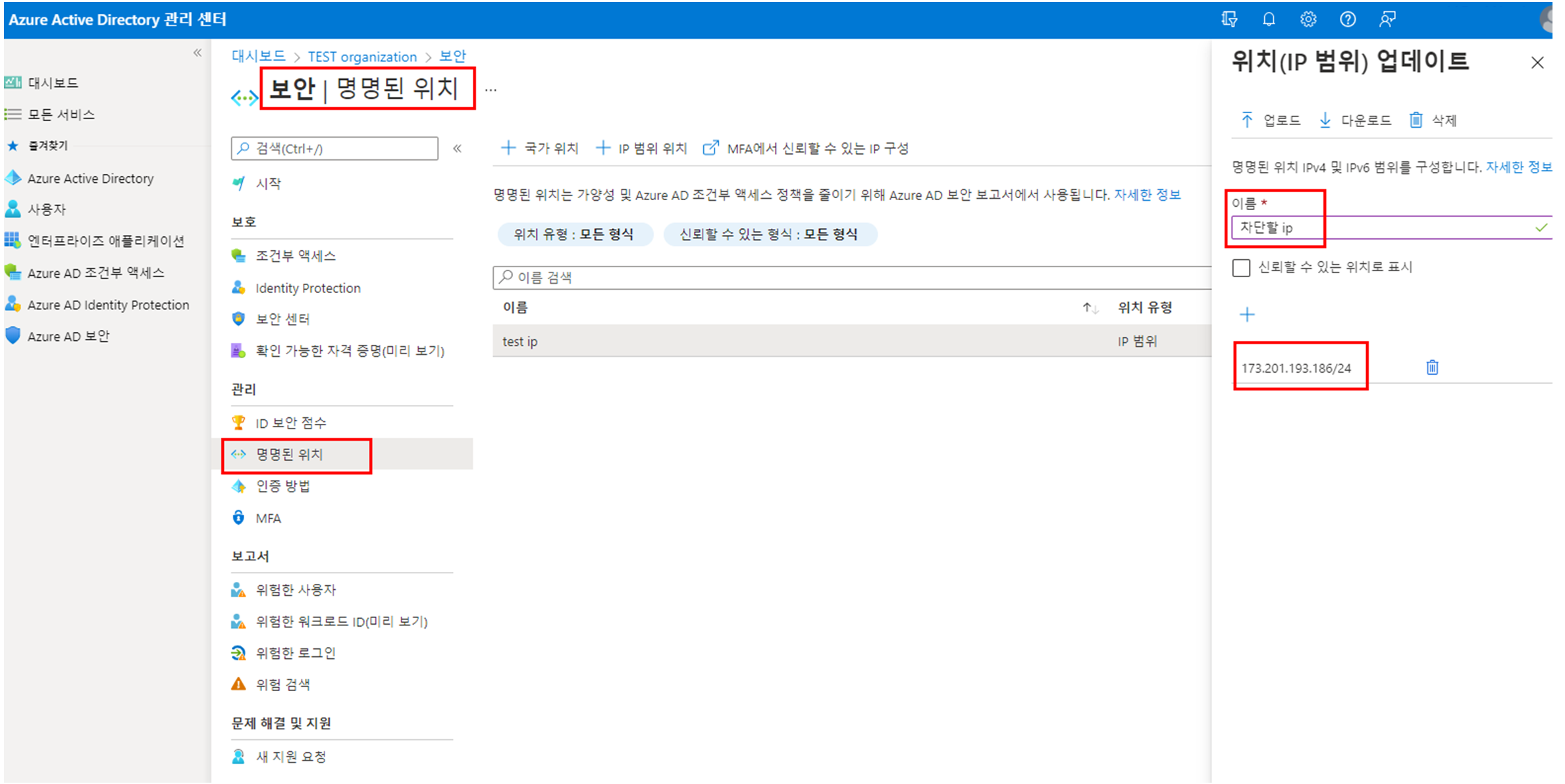 Azure Active Directory > 보안 -> 명명된 위치 -> 위치추가