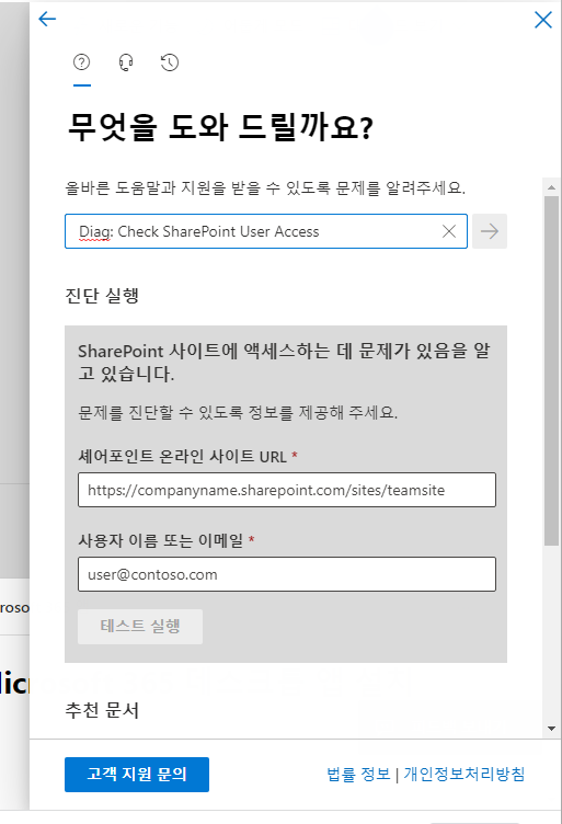 셰어포인트 온라인 사이트 URL 과 문제가 생기고 있는 계정 메일 주소를 입력을 해주고 자가 진단이 진행 되고