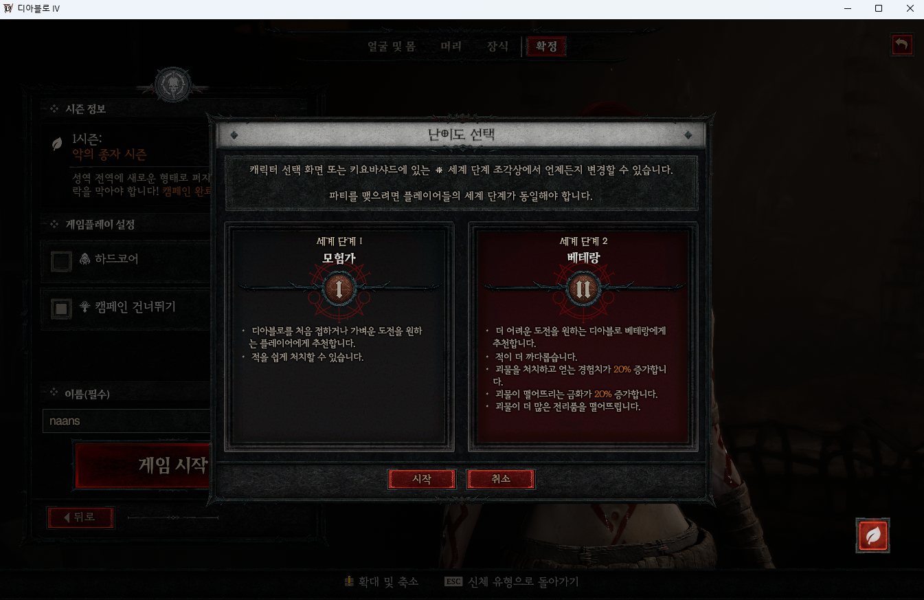 캠페인 건너뛰기 항목과 하드코어 항목 2개 선택이 가능했다. 캠페인 건너뛰기를 눌러서 계정을 생성했다.