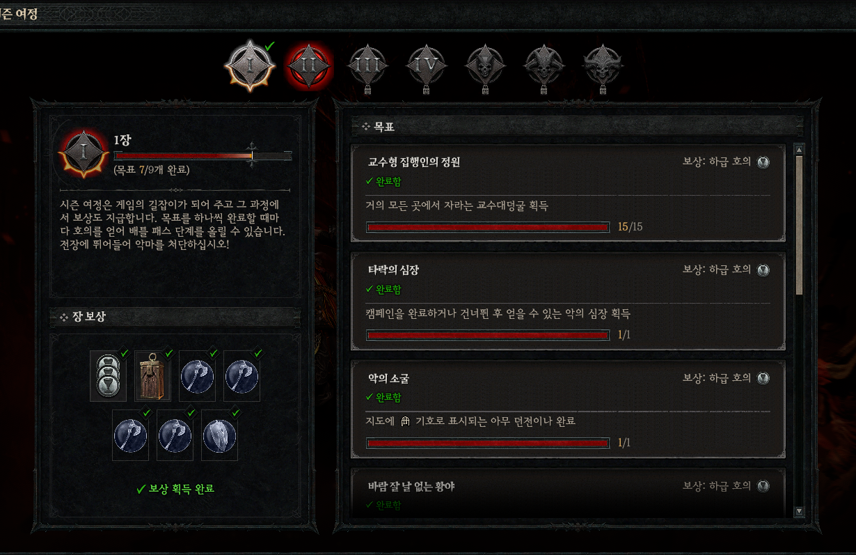 시즌 여정은 모두다 완료해야 다음으로 넘어가는게 아니고 최소 요구갯수가 있다 이것만 완료하면 다음장으로 넘어갈수 있으니 굳이 어려운건 패스해도 장 보상을 받을 수 있다.