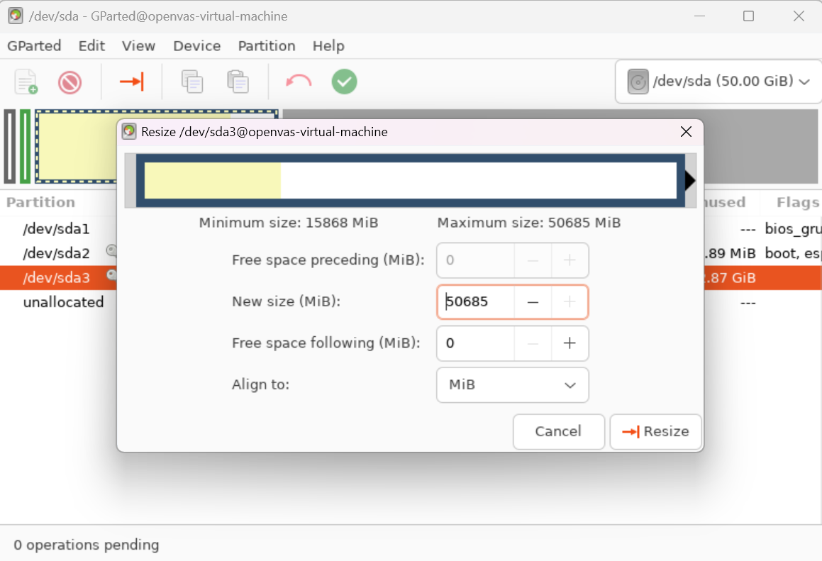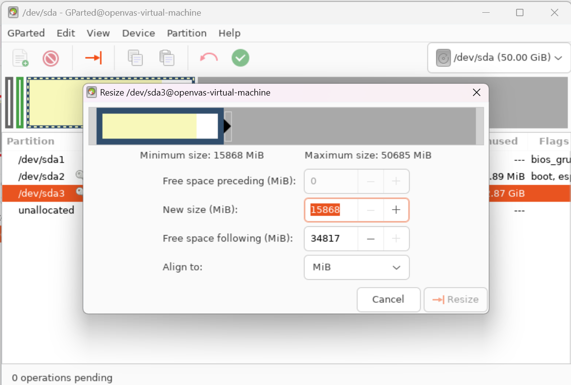 sda3 에 마우스 오른쪽 버튼 눌러서 resize/move 눌러보자