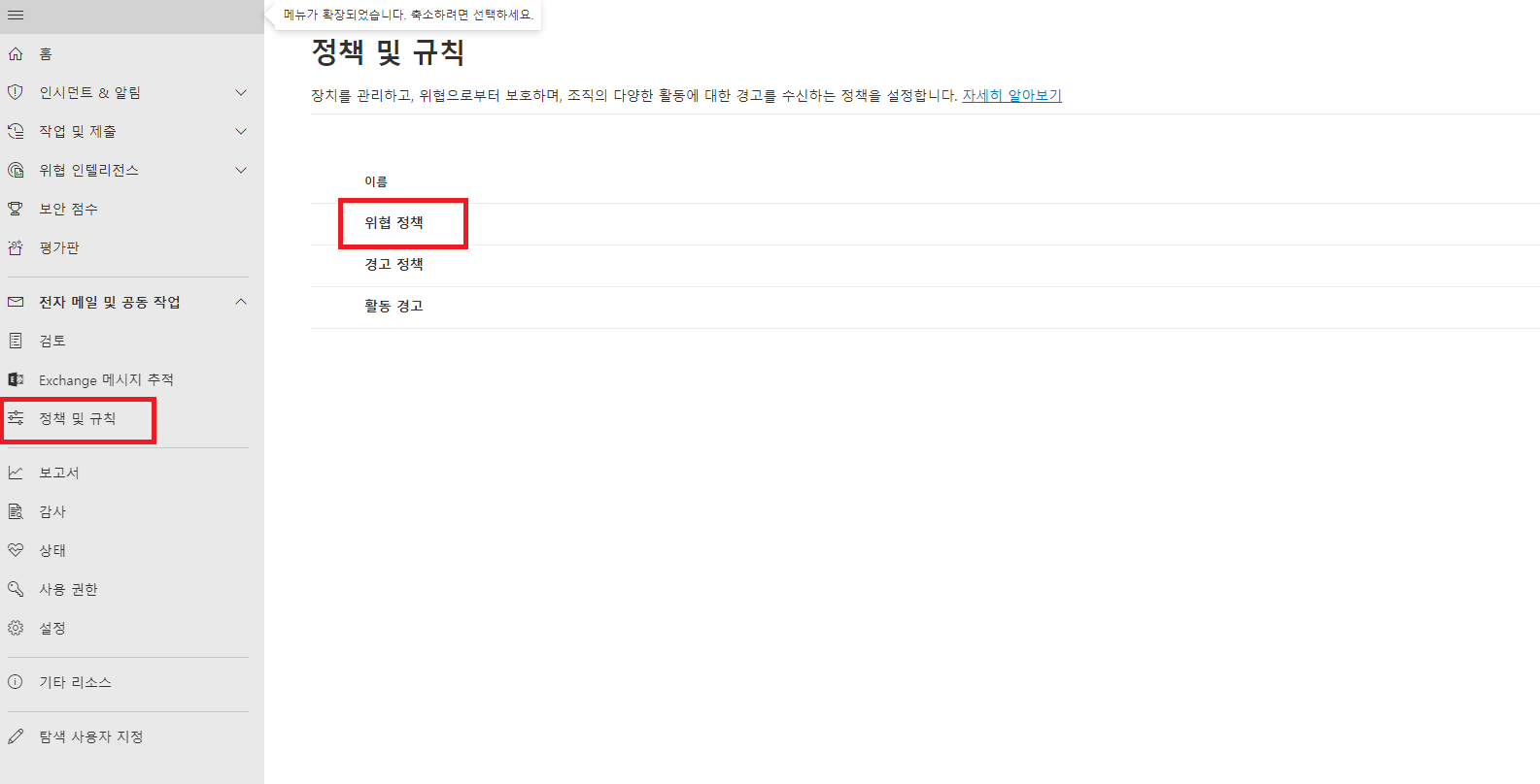 정책 및 규칙 -> 위협 정책