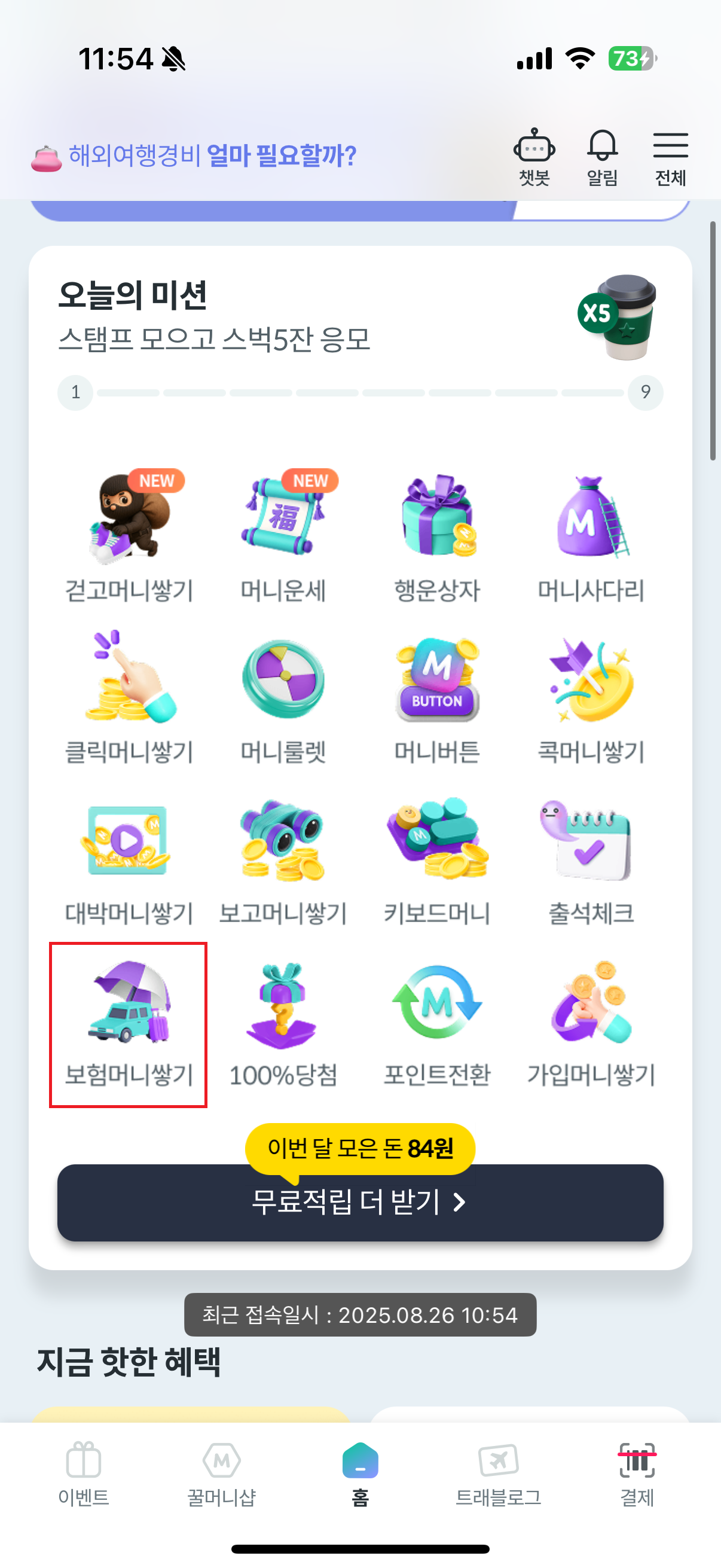 어플에 들어가서 메인 화면 아래쪽에 보면 보험머니 쌓기가 있다.