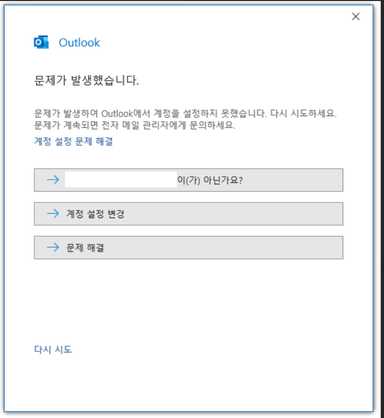 Outlook 문제가 발생했습니다. 문제가 발생하여 Outlook에서 계정을 설정하지 못했습니다. 다시 시도하세요.