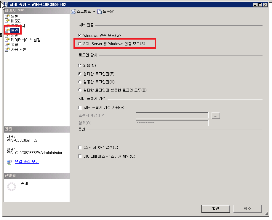 보안 - SQL Server 및 Windows 인증 모드 선택을 해주자.