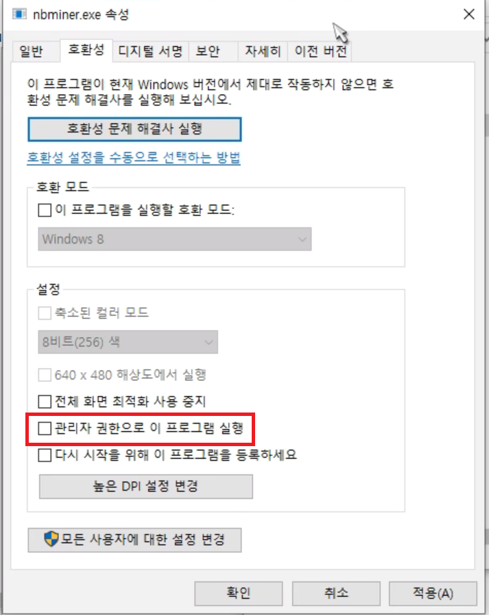 관리자 권한으로 이 프로그램 실행을 체크 하고 적용을 누르자.