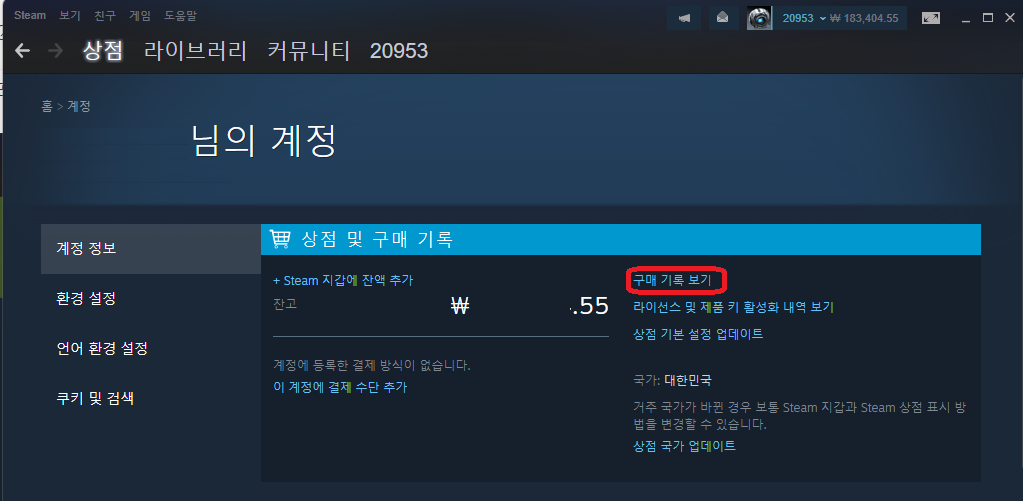 계정정보가 나오고 거기에 구매 기록 보기를 눌러보면