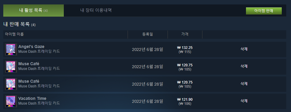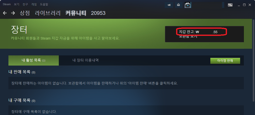 판매 내역을 보려면 커뮤니티 - 장터를 보면 된다.