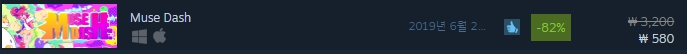 Muse Dash(리듬액션게임) 라는 게임이 지금 여름 할인 중이라서 580원에 판매 한다.(뭐 이런 케이스는 드물긴 하다.)