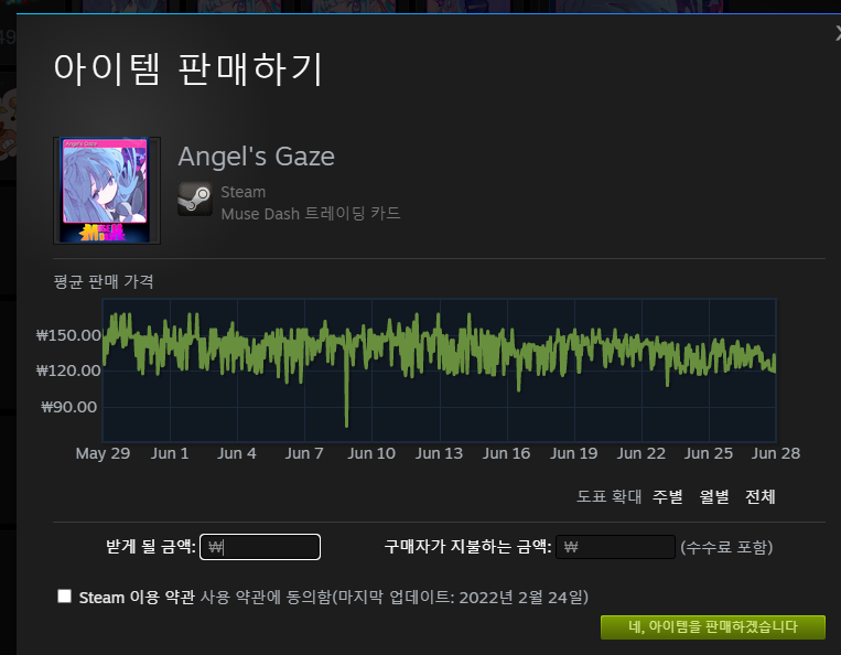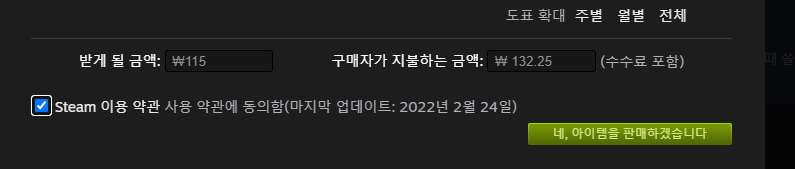 132.63원에 팔려면 115에 팔아야 한다 이렇게 금액을 정하고 약관 동의 하고 아이템 판매를 누르면 된다.