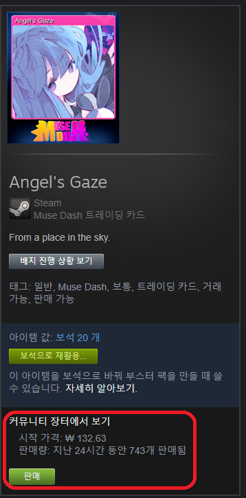 카드를 클릭 하여 정보를 보면 장터에 판매가 가능한 금액이 뜬다. 저 카드 최근 판매 금액은 132.63원이다.