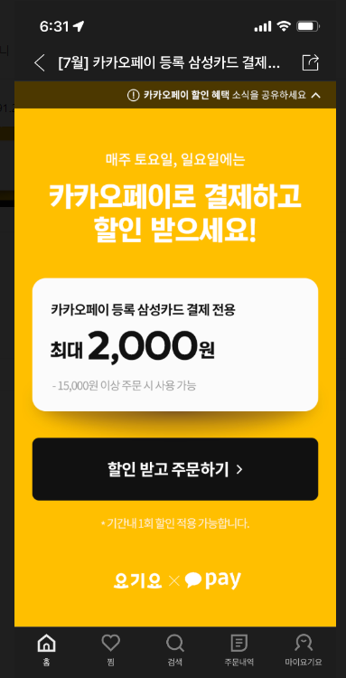 매주 토요일, 일요일에는 카카오페이 등록된 삼성카드로 결제시 최대 2,000원 할인