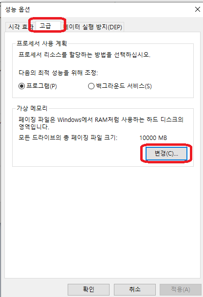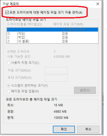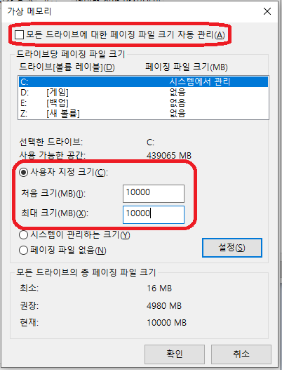 자동 체크를 풀고 사용자 지정 크기로 선택 하여 처음 크기 최대 크기를 설정 해주자.