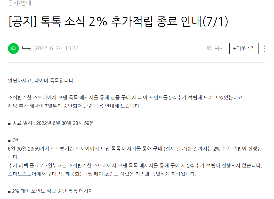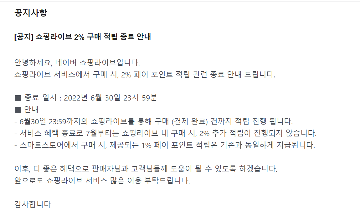 7월 부터 네이버 톡톡, 쇼핑라이브 구매 적립 종료 되었다.