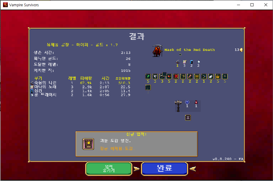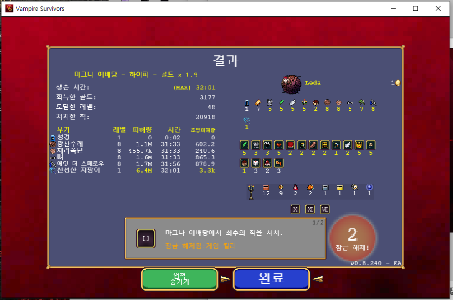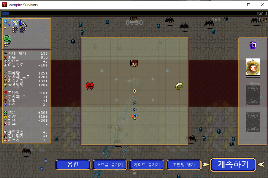 | 뱀파이어 서바이버즈(Vampire Survivors) 뱀파이어 서바이벌 0.8.0 패치 신규케릭 Gains 보로스 해금 방법 (1) | 2022.07.10 |