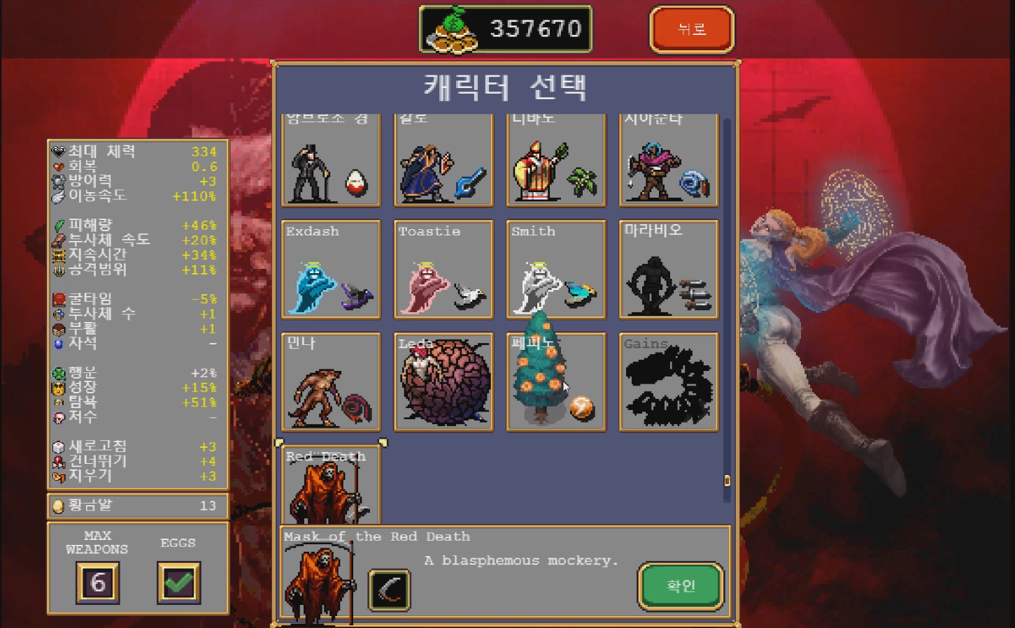 뱀파이어 서바이버즈(Vampire Survivors) 뱀파이어 서바이벌 0.8.0 패치 신규케릭 Gains 보로스 해금 방법