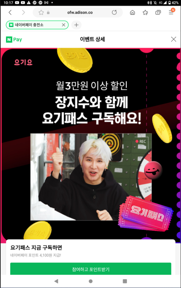아래와 같은 이벤트 진행중이다. 요기패스 지금 구독하면 네이버 포인트 4,100원 지급