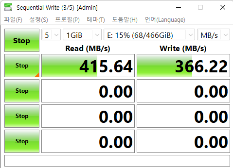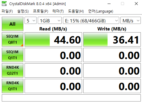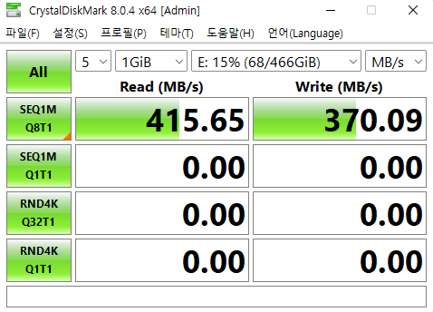 속도 테스트 프로그램은 크리스탈디스크마크 라는 프로그램이고