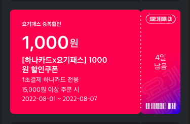 중복 가능한 쿠폰을 랜덤하게 뿌릴듯 하다. 지금은 하나카드 전용으로 나왔고 8/1 ~ 8/7일까지 가능한 쿠폰이 어플에 있다.