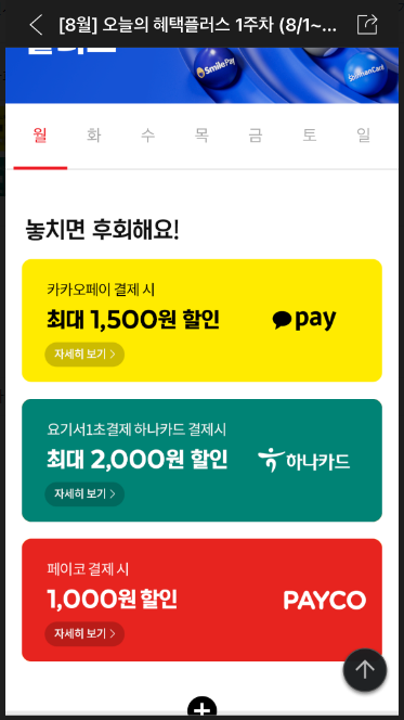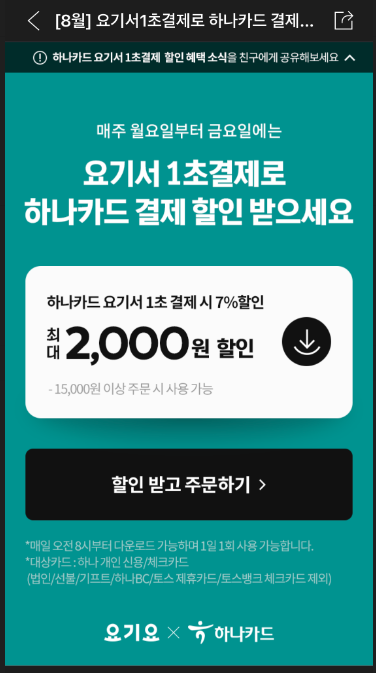 중복 가능한 쿠폰을 랜덤하게 뿌릴듯 하다. 지금은 하나카드 전용으로 나왔고 8/1 ~ 8/7일까지 가능한 쿠폰이 어플에 있다.