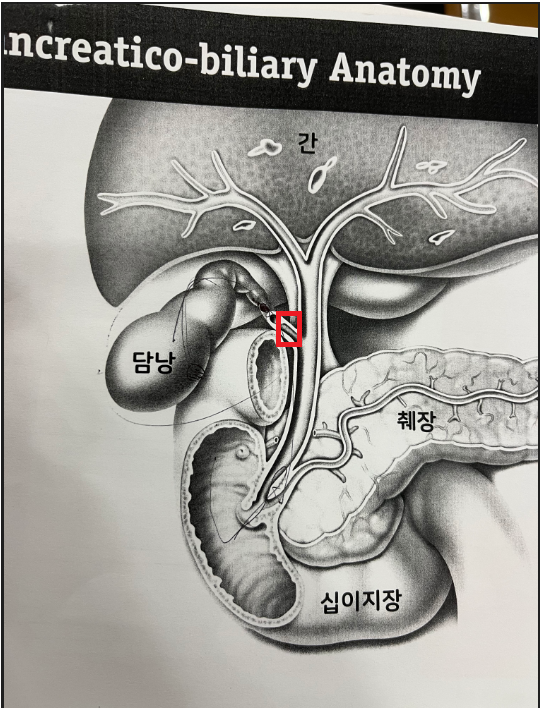 빨간색 위치를 이야기 하시면서 이 위치에 담석이 있어서 막혔다 빠졌다 하면서 통증을 유발 한다고 이야기 해주셨다.