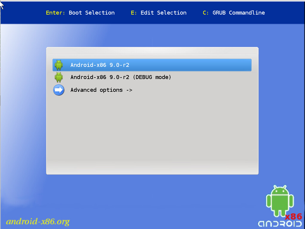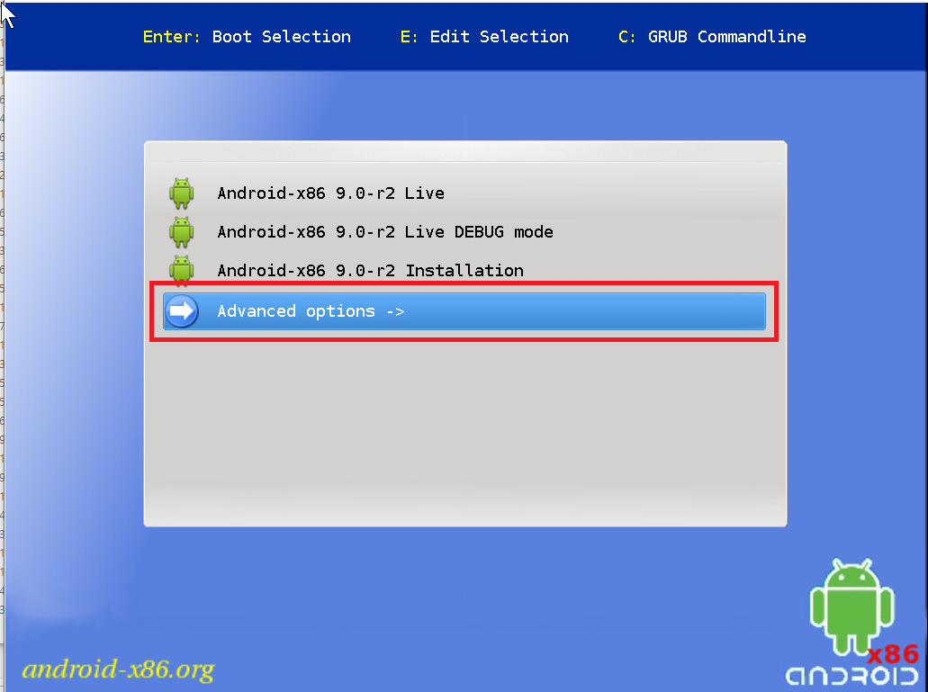 USB 부팅이 되고 안드로이드 설치 메뉴가 뜬다 맨 밑에 있는 Advanced options 을 선택 하자.