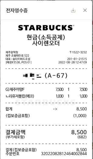 리유저블컵(에코컵) 포함해서 8,500원 안그래도 스타벅스 커피 비싼데 리유저블컵 때문에 더 비싸보인다.