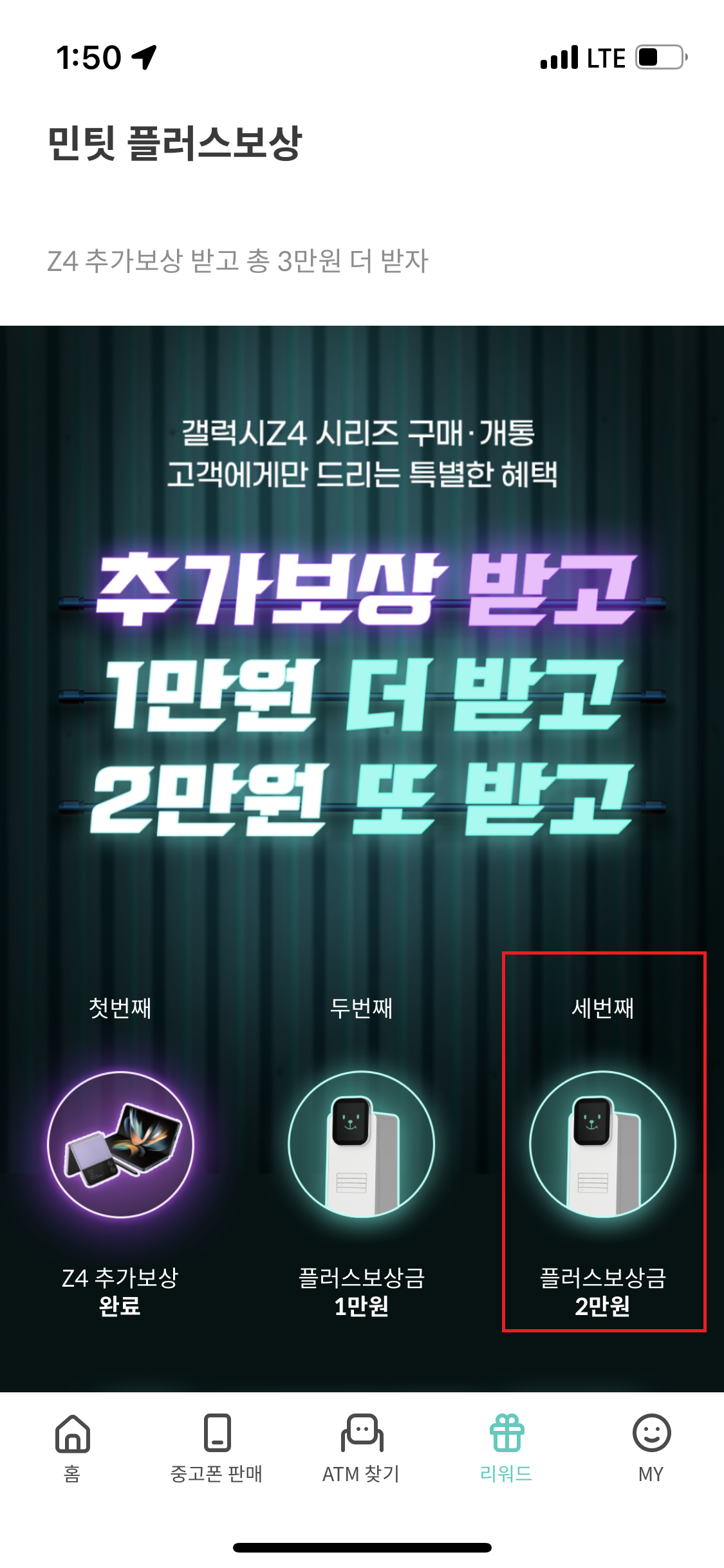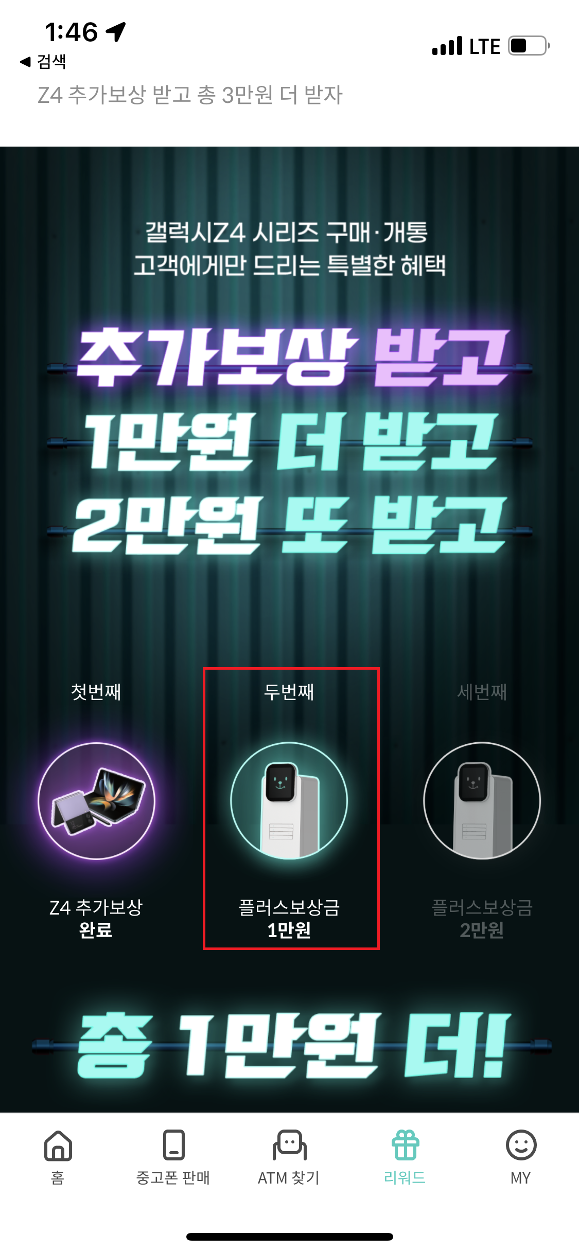 리워드에 들어가면 플러스보상금 1만원이 흑백에서 컬러로 변경되었다.