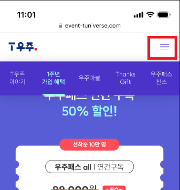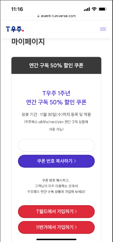 11번가에서 가입하면 slim, mini 만 있으니 all 이나 life 가입자는 T월드에 들어가서 가입 하면된다.