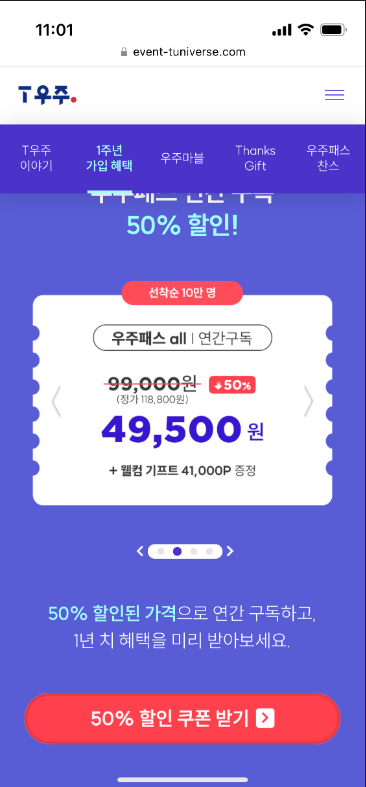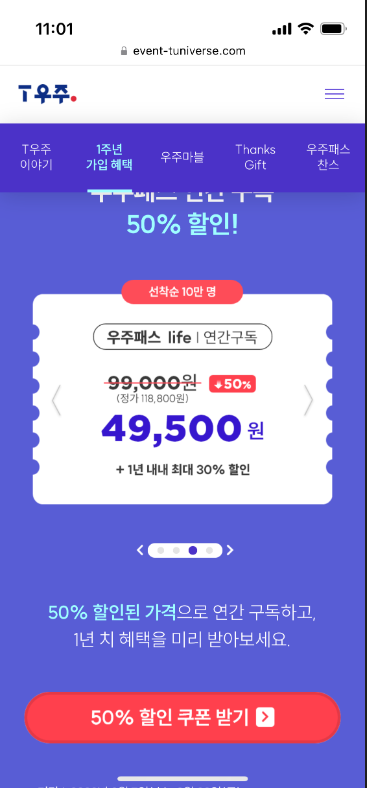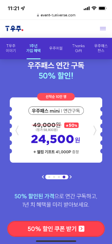 9월7일 부터 우주패스 연간 구독 50% 할인 이벤트 진행한다.