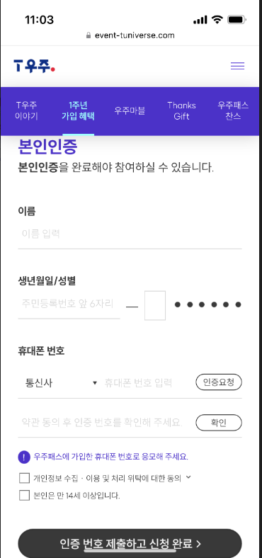 SKT 회선 사용자가 아니면 인증이 안되니 꼭 SKT 회원으로 인증을 하자.