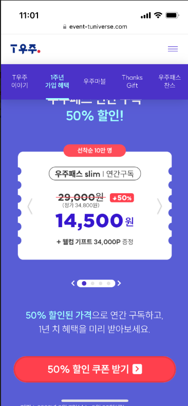 하지만 SKT 회원만 쿠폰을 받을 수 있다. 주의할점은 10만명 한정이다!
