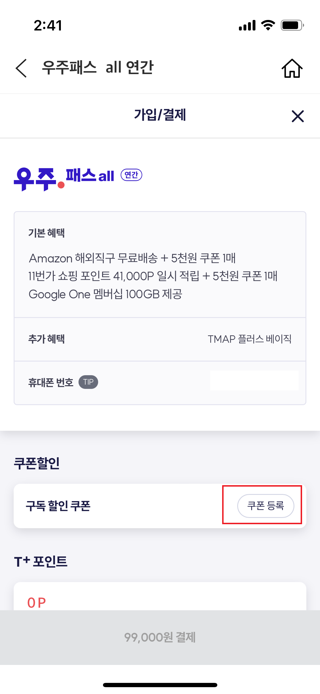 위에서 받은 쿠폰을 쿠폰 등록을 하면 99,000원이