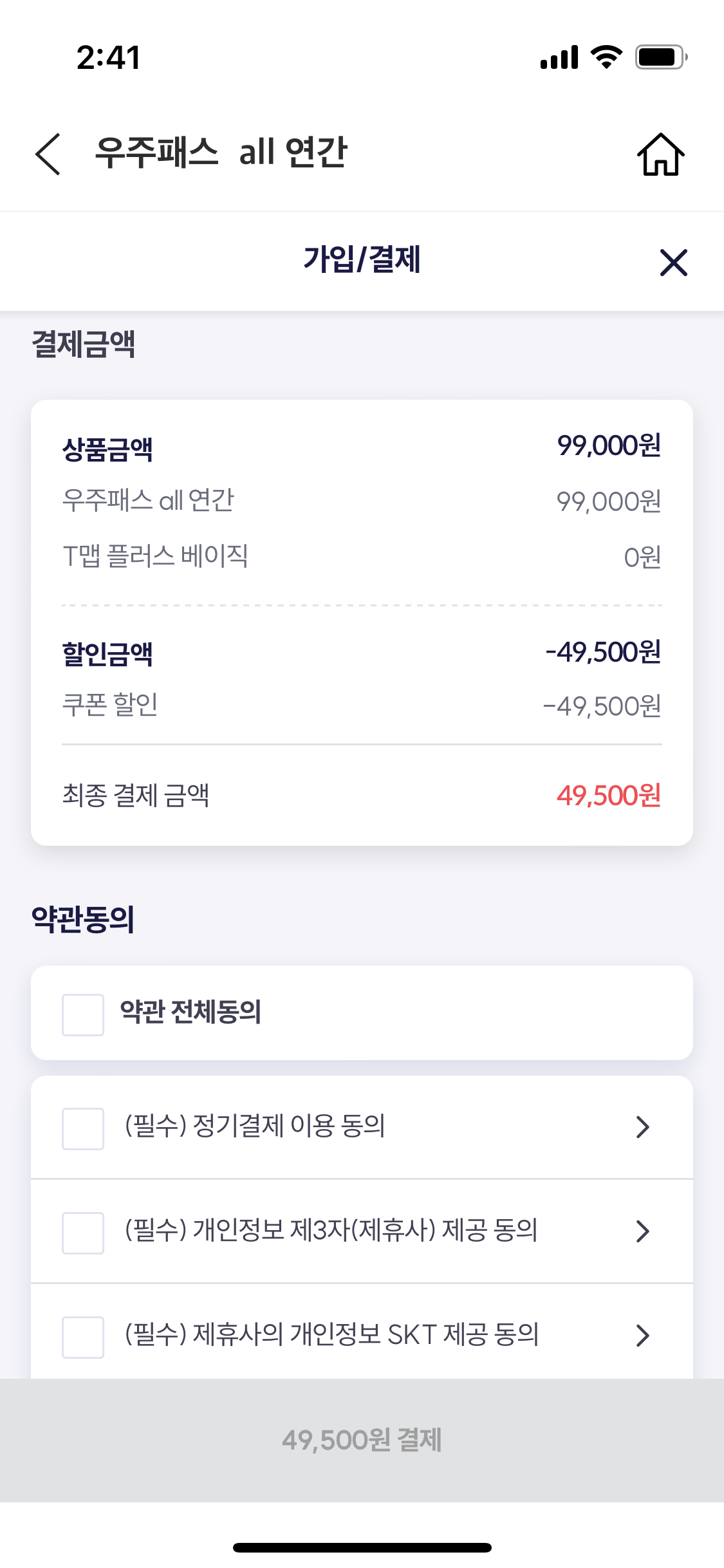 49,500원으로 변경 된다. 난 T맵 플러스 베이직을 선택 했다