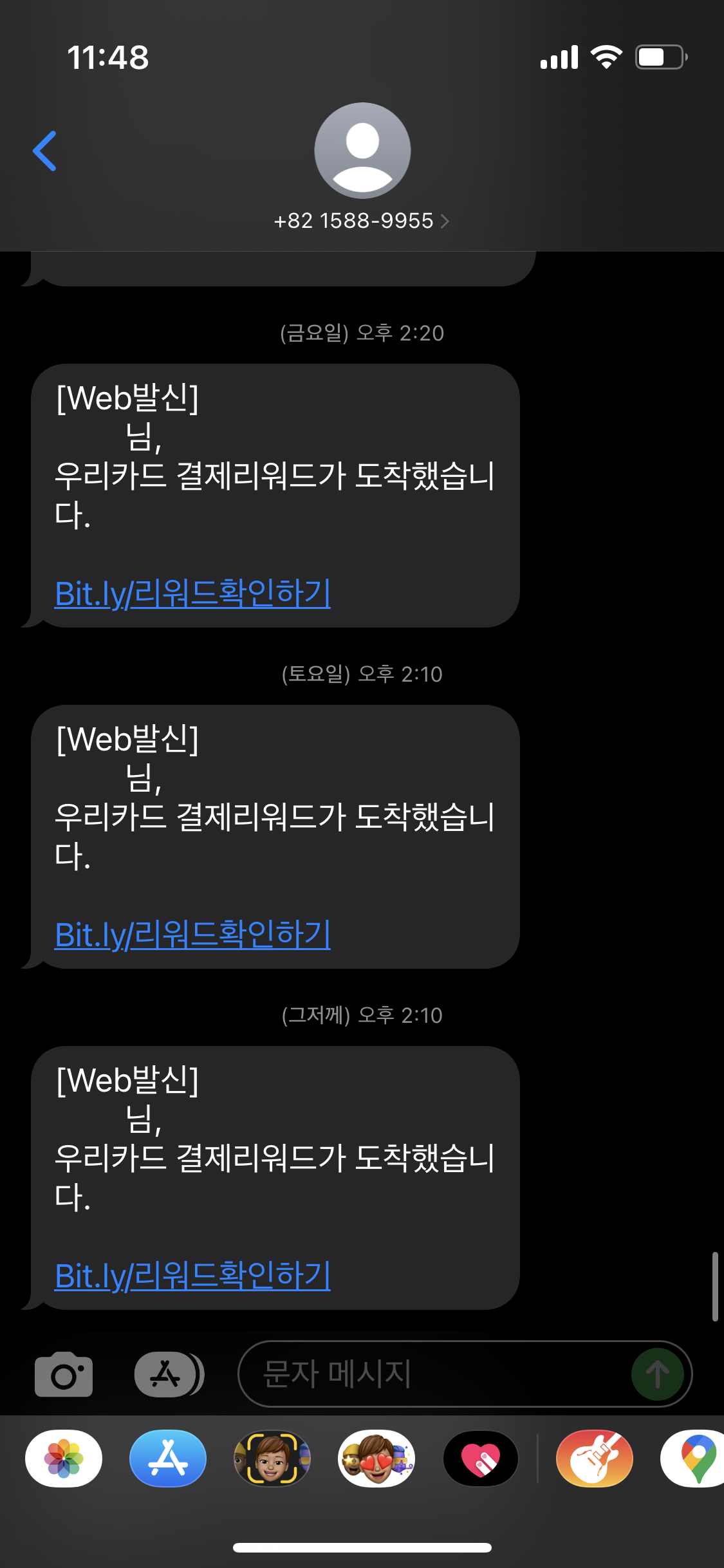 님, 우리카드 결제리워드가 도착했습니다. Bit.ly/리워드확인하기 라고 하면서 문자가 온다.