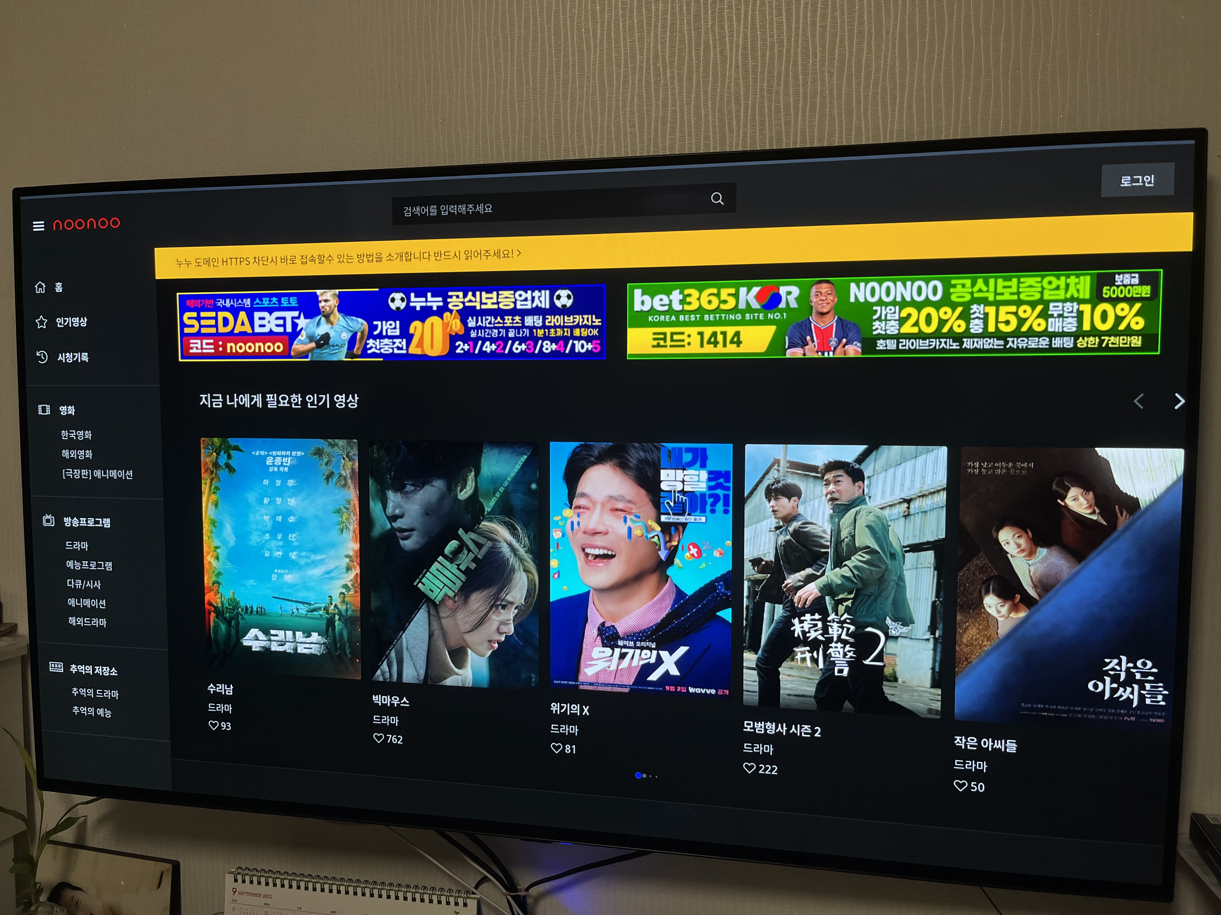 https://noonoo.tv/ 요즘 정말 핫한 누누TV 이다. 로그인도 없이 영화 드라마 예능 등을 스트리밍 서비스로 볼 수 있는 사이트다. 버퍼링이 걸리는 영상들도 있고 연결이 문제 있는 스트리밍이 있기도