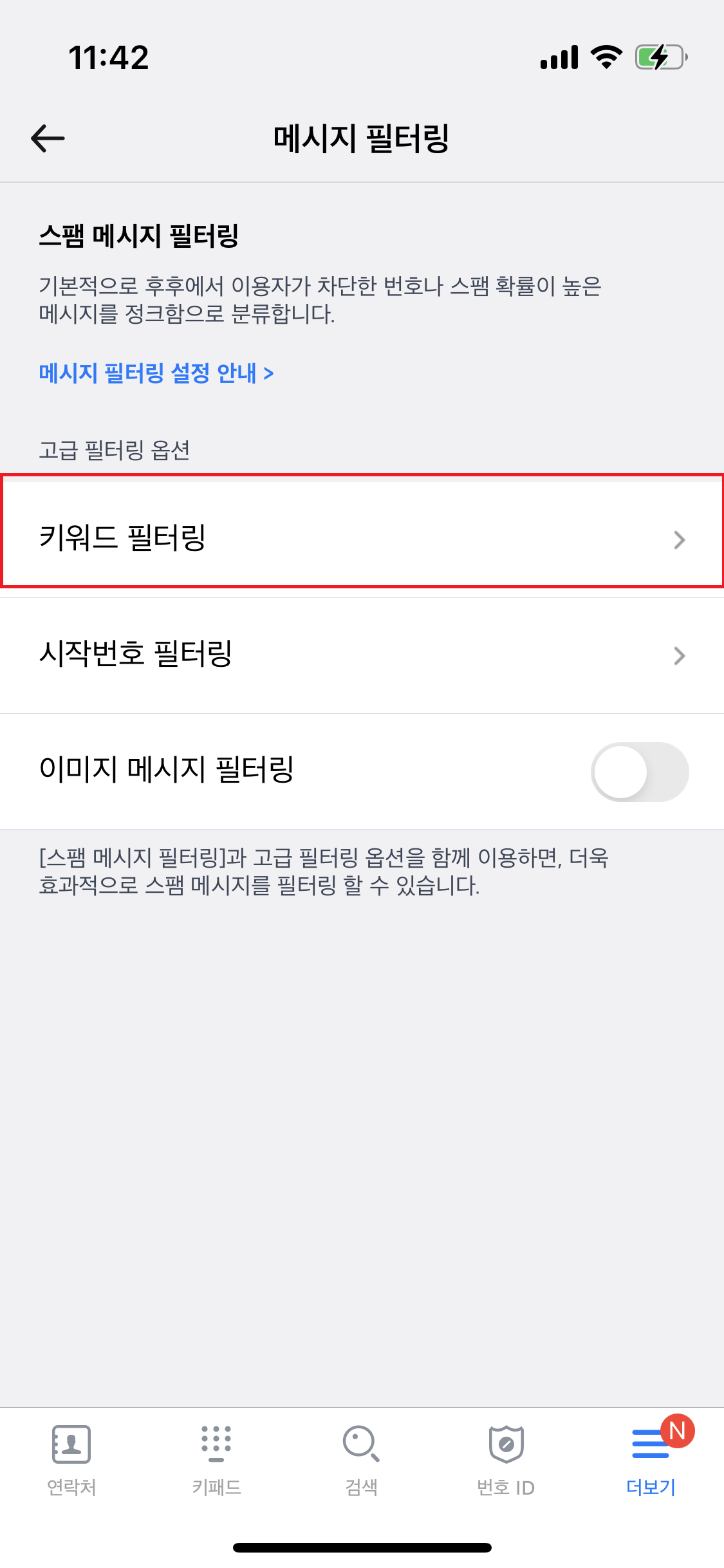 등록을 하고 나면 해당 키워드로 오는 문자는 모두다 스팸으로 들어간다.