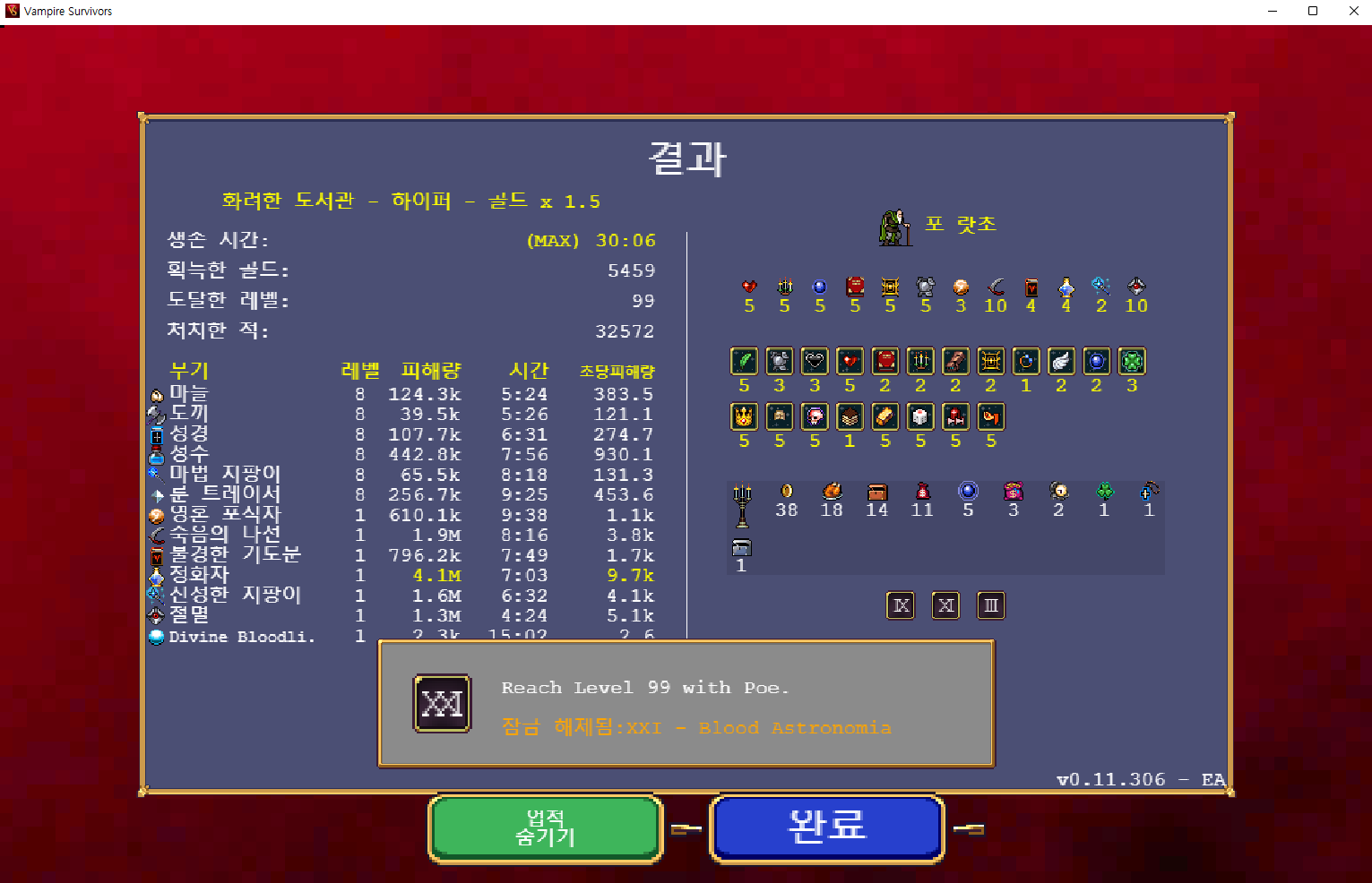 | 뱀파이어 서바이버즈(Vampire Survivors) 뱀파이어 서바이벌 0.10.0 히든 케릭터 Trouser 해금 방법 (0) | 2022.08.09 |