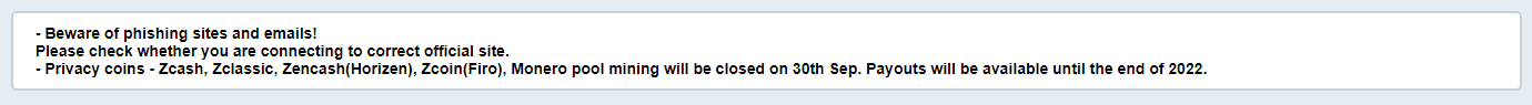 - Privacy coins - Zcash, Zclassic, Zencash(Horizen), Zcoin(Firo), Monero pool mining will be closed on 30th Sep. Payouts will be available until the end of 2022.