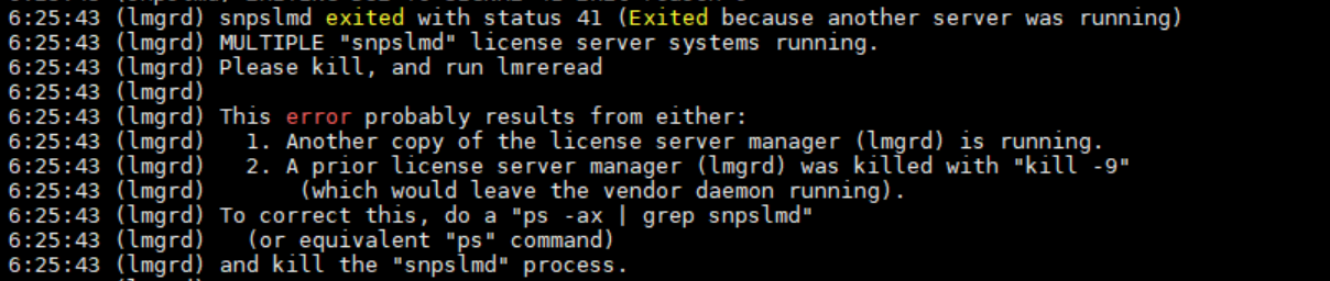 snpslmd exited with status 41 (Exited because another server was running) 에러 없이 구동이 가능하다.