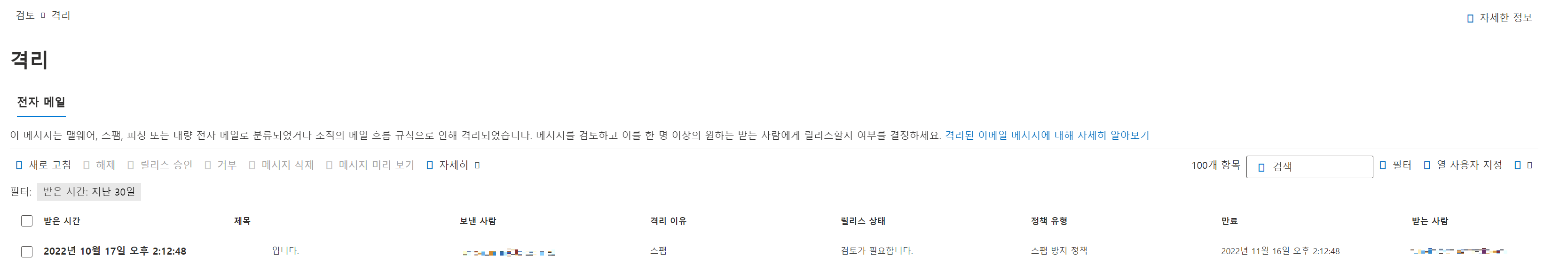 스팸으로 식별되어 격리 되었다고 뜬다. 해당 메일이 정상적인 메일이라면 해제를 해주자.