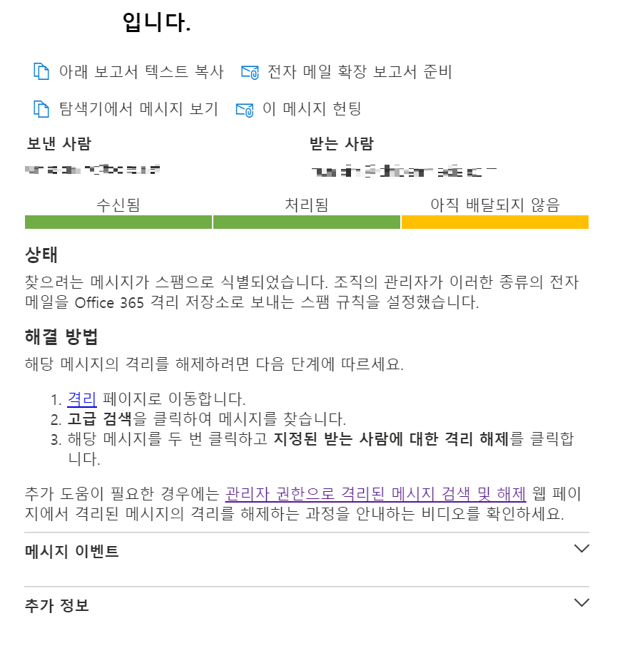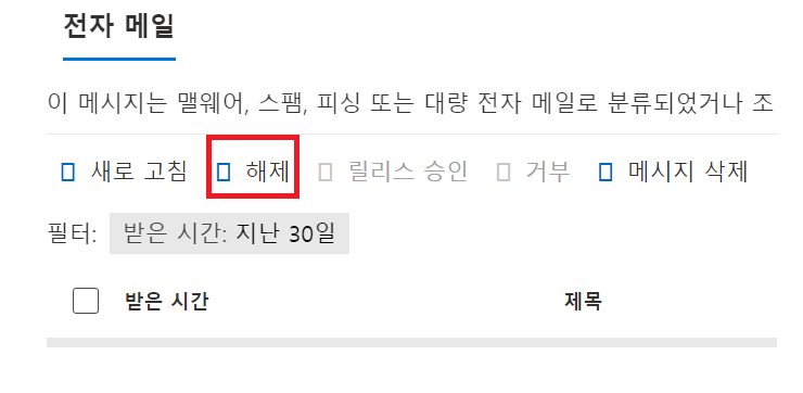 스팸으로 식별되어 격리 되었다고 뜬다. 해당 메일이 정상적인 메일이라면 해제를 해주자.