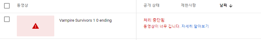 간간히 유튜브에 영상을 올려보고 있는데 위와 같이 동영상이 너무 길다고 처리 중단되었다.