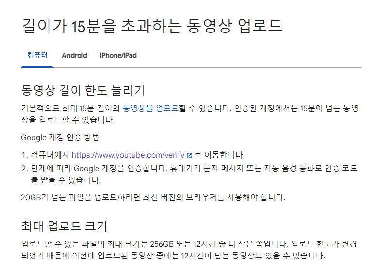 자세히 보기를 누르면 15분 초과하는 동영상 업로드 하는 방법이 나와 있다.