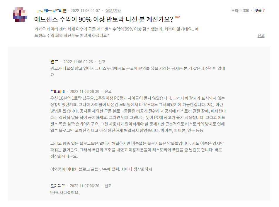 카카오 IDC 센터 화재로 인해 티스토리 접속 장애 이후 애드센스 수익이 99% 이상 하락을 했다.