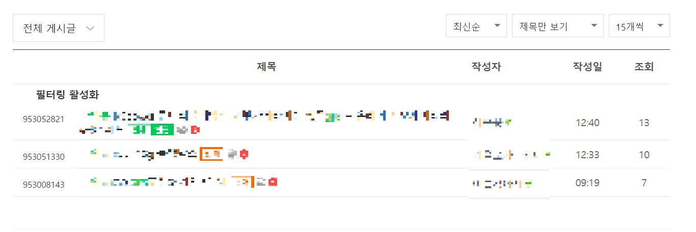 필터링 자동으로 등록되어 검색시 해당 게시글이 필터가 되어 안보이게 된다.