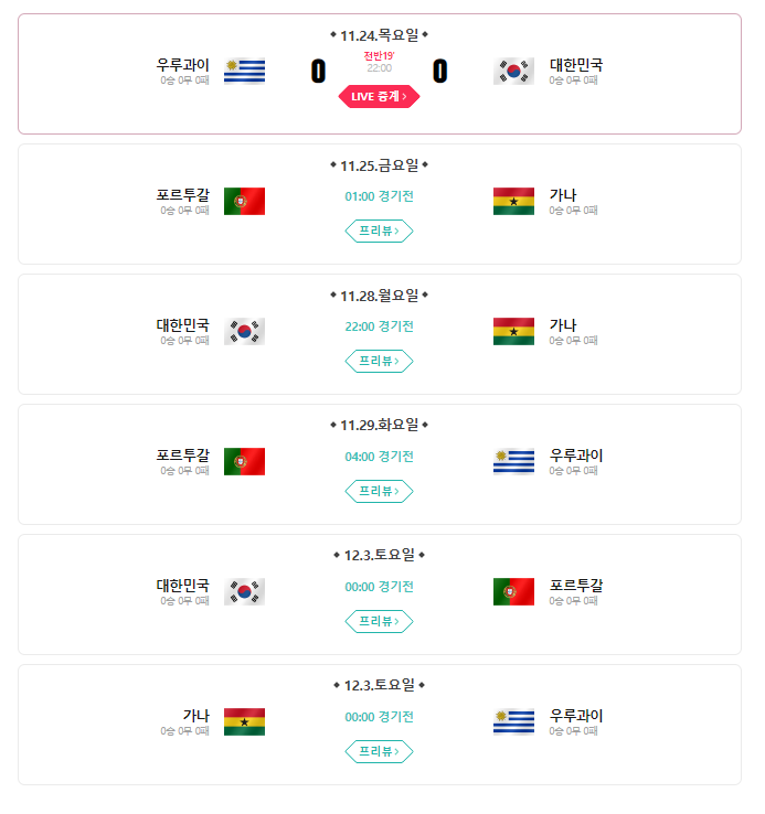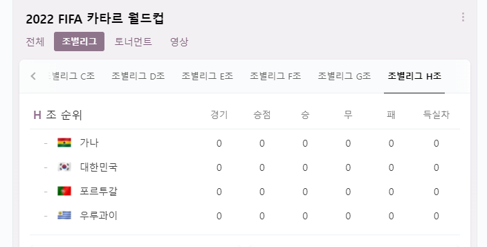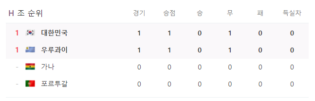 우리나라는 월드컵 H조 이고 대한민국, 가나, 포르투갈, 우루과이 이다.