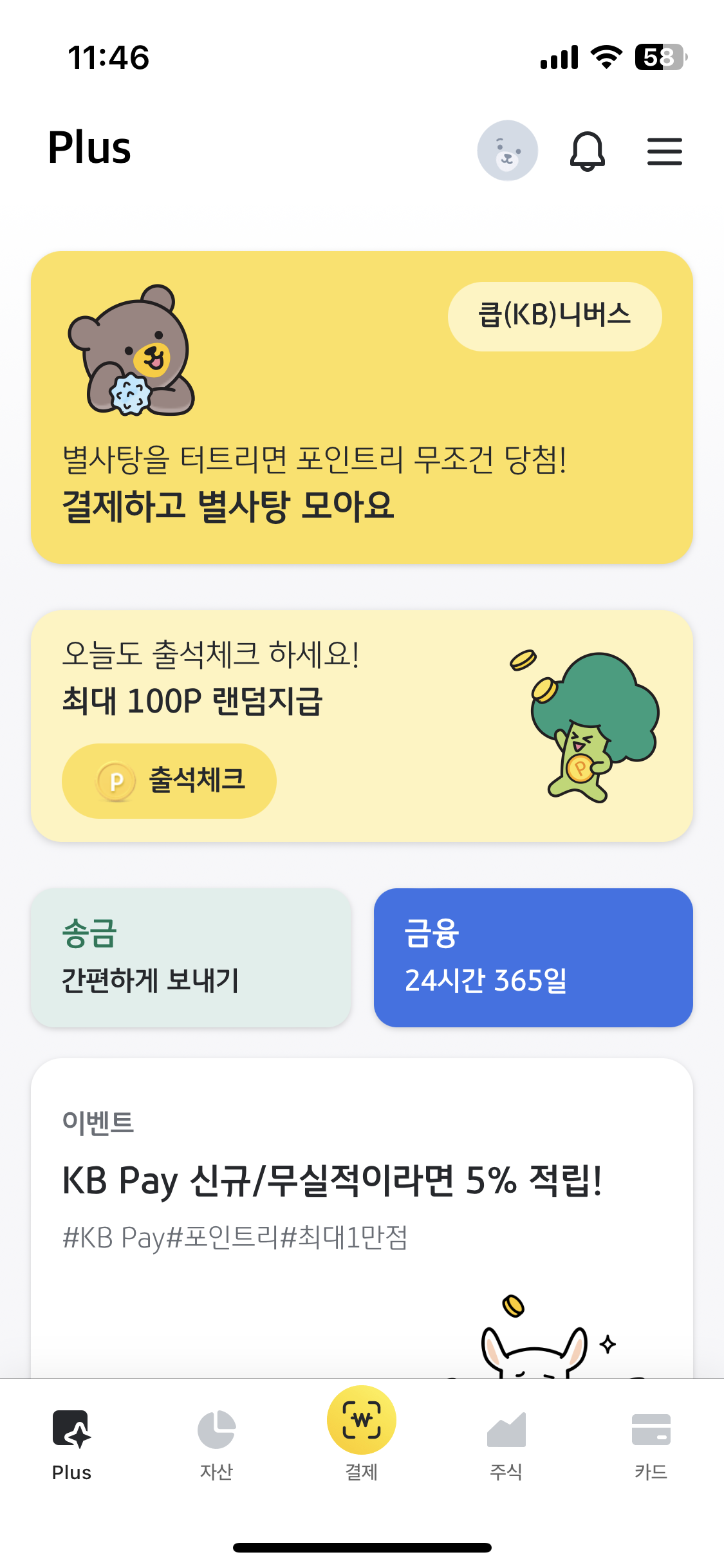 KB Pay 어플 Plus 맨앞에 가보면 출석체크 할 수 있다.