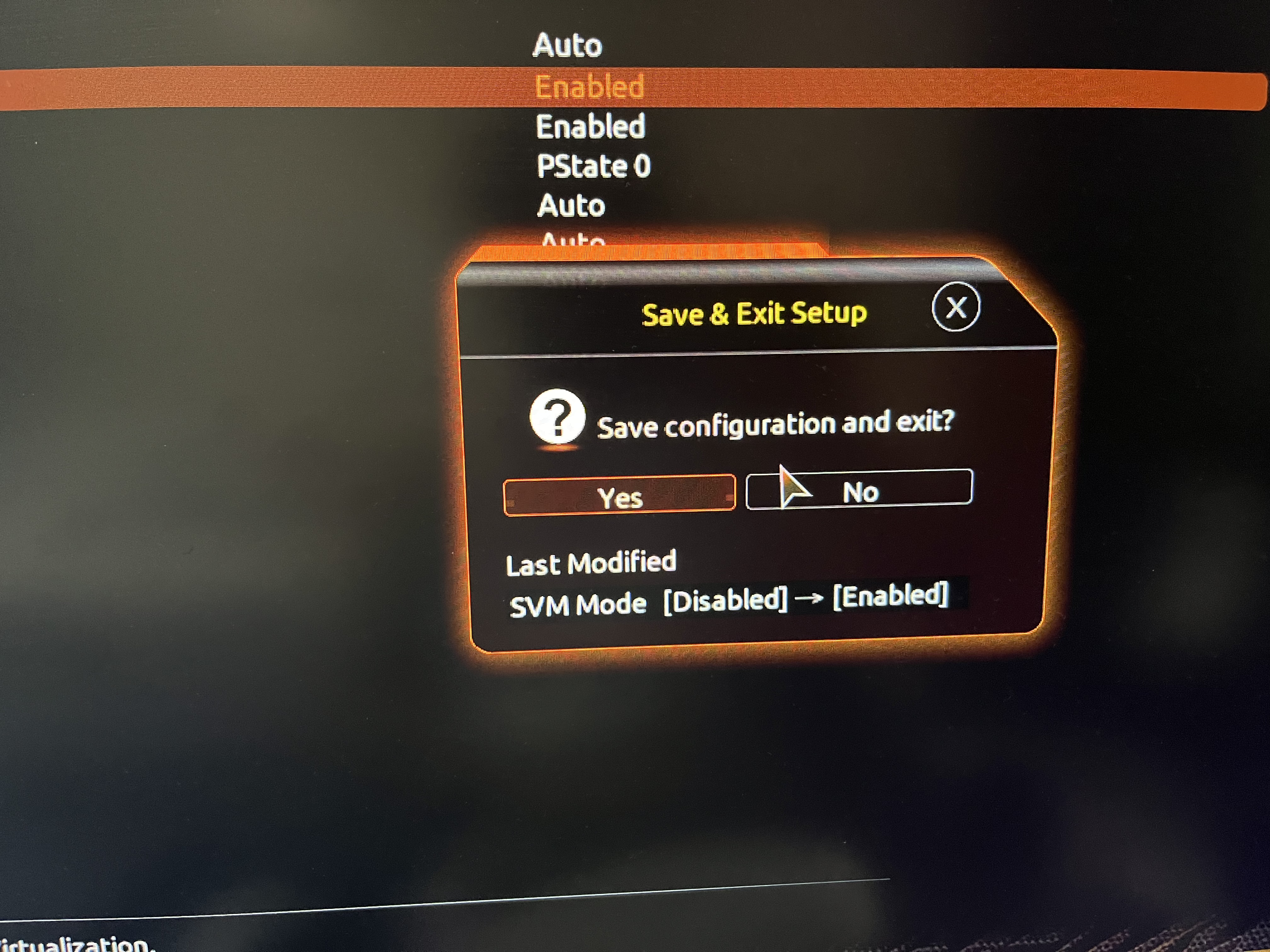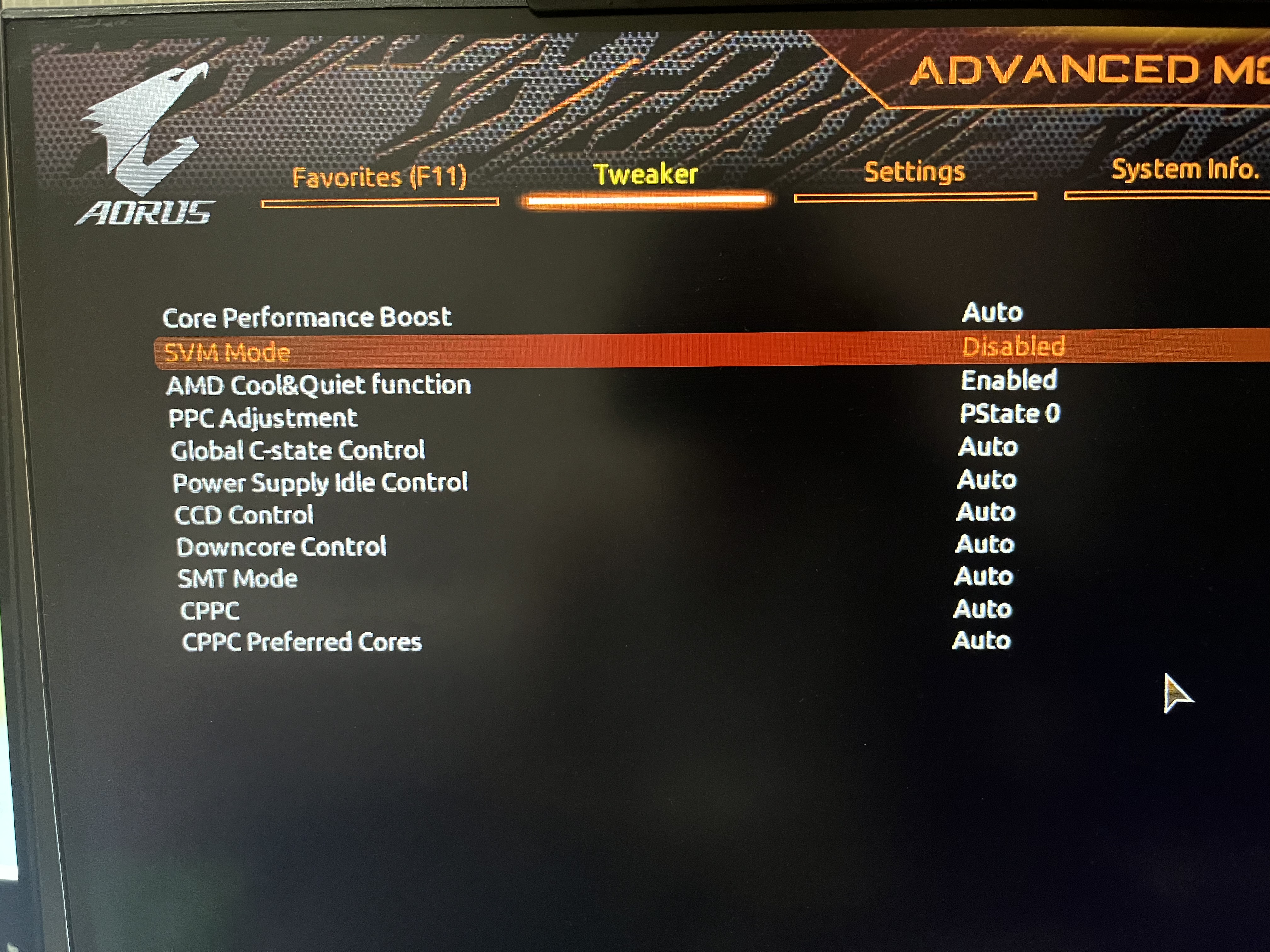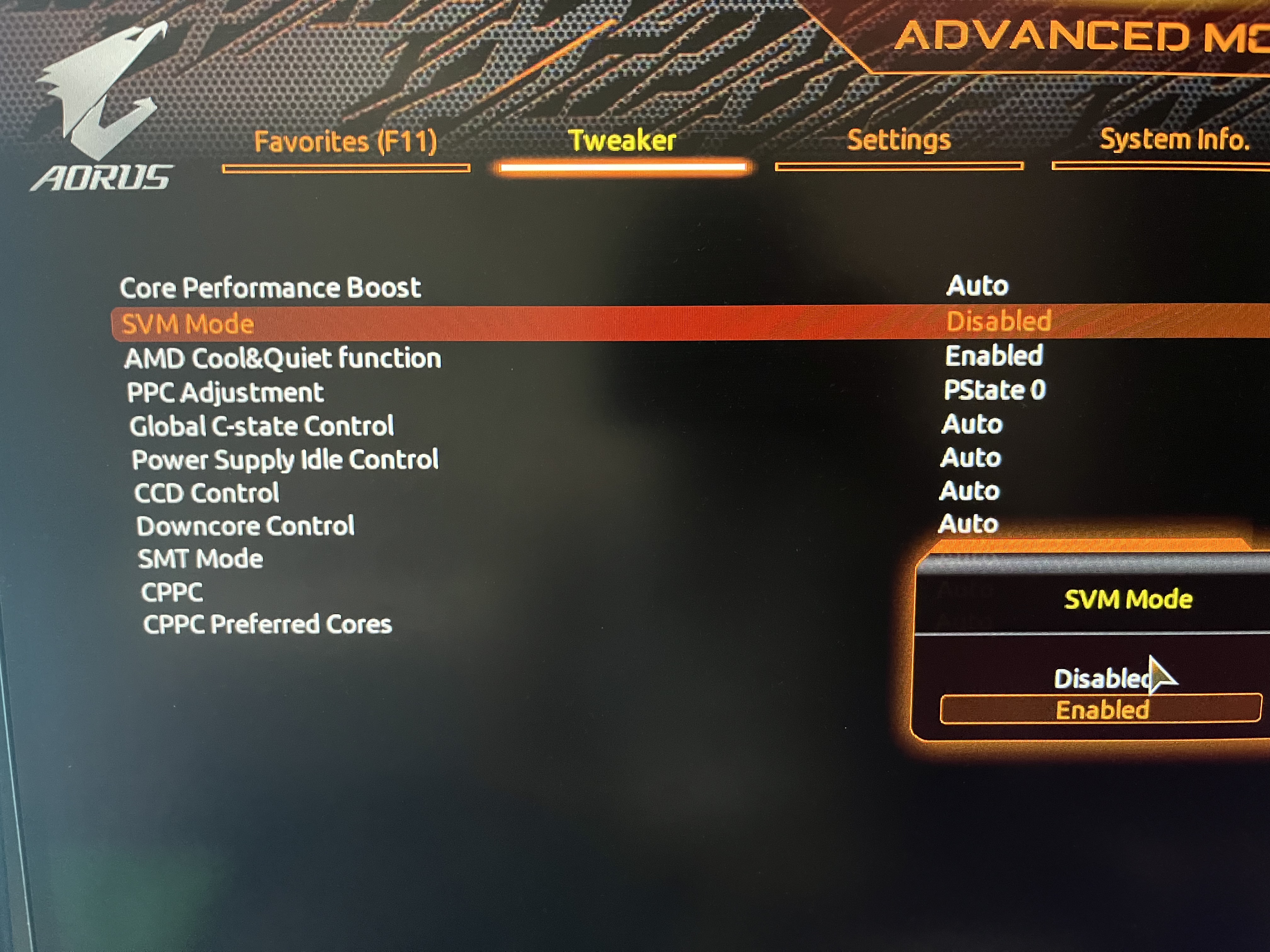 SVM Disabled 으로 되어 있다 이걸 Enabled 로 변경 하자.
