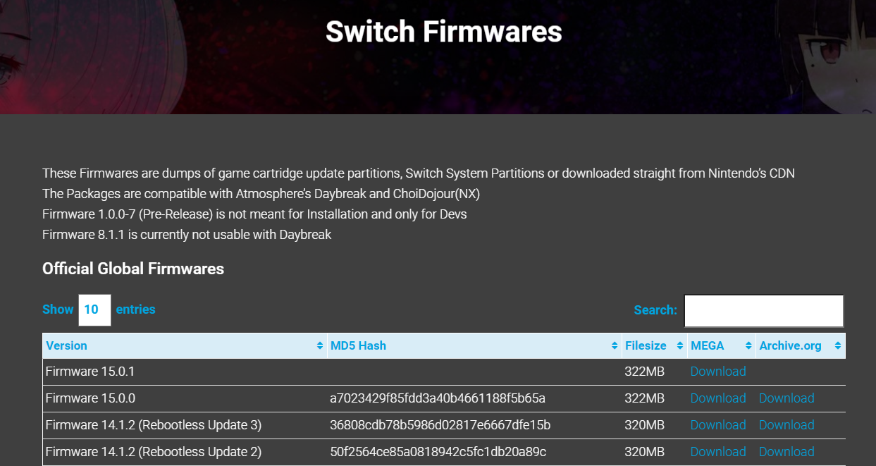 These Firmwares are dumps of game cartridge update partitions, Switch System Partitions or downloaded straight from Nintendo’s CDNThe Packages are compatible with Atmosphere’s Daybreak and ChoiDojour(NX)Firmware 1.0.0-7 (Pre-Release) is not meant for I
